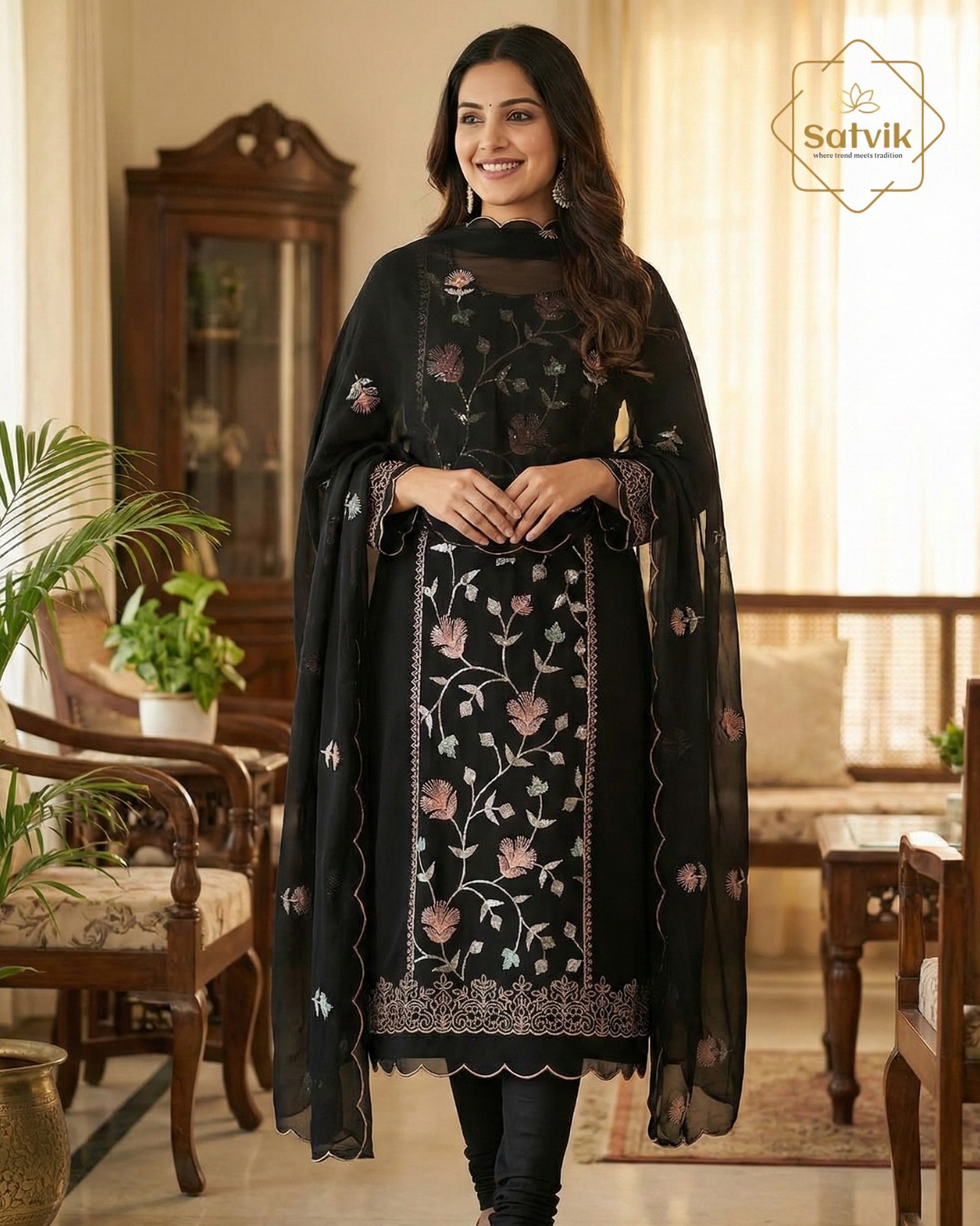 Dupatta: Georgette fabric with embroidery and sequin work throughout and with scalloped border