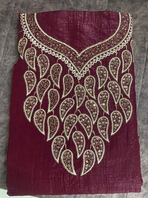 Top – Maroon  shade vichitra silk with heavily detailed yoke with intricate golden thread embroidery and sequin work