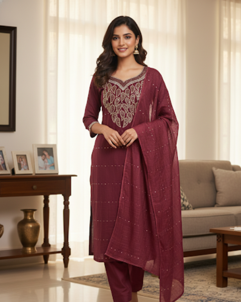 Duppatta – Vichitra silk with minor  embroidery and sequin work threadwork.